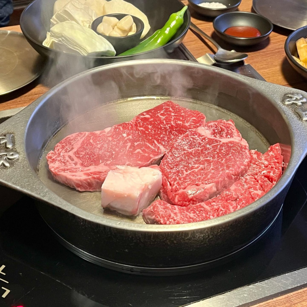 🍽 おすすめメニュー: しゃぶ韓牛モクシムセット(韓国牛チャックロールしゃぶしゃぶ)、すき焼きU.S.チャドルバギ(アメリカ産牛ブリスケットすき焼き)、明太クリームうどん(辛い明太子クリームうどん)、卵粥(しゃぶしゃぶの後)、ポックンうどん(すき焼きの後)。