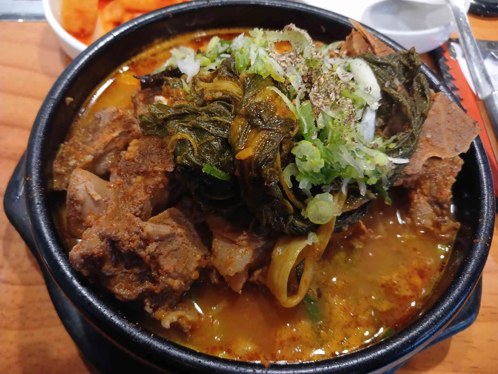 🍽 おすすめメニュー: 炭火骨付きチム(炭火焼き豚骨煮込み – シンラーメンくらいの辛さ、もやしと合わせるとさらに美味しい)、カムジャタン、骨付きヘジャンクク(豚骨二日酔いスープ – 透明なスープが特徴)。