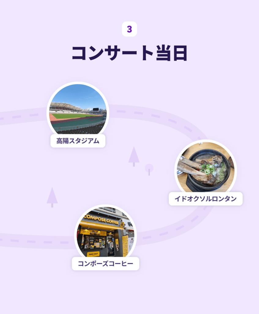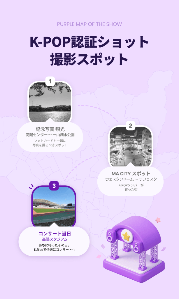 Purple Map of the Showの最終章です!記念すべき公演のD-Day(当日)はもちろん、開演前の熱気を感じたい方も必見。ショーの心臓部である高陽総合運動場エリアのガイドをお届けします!