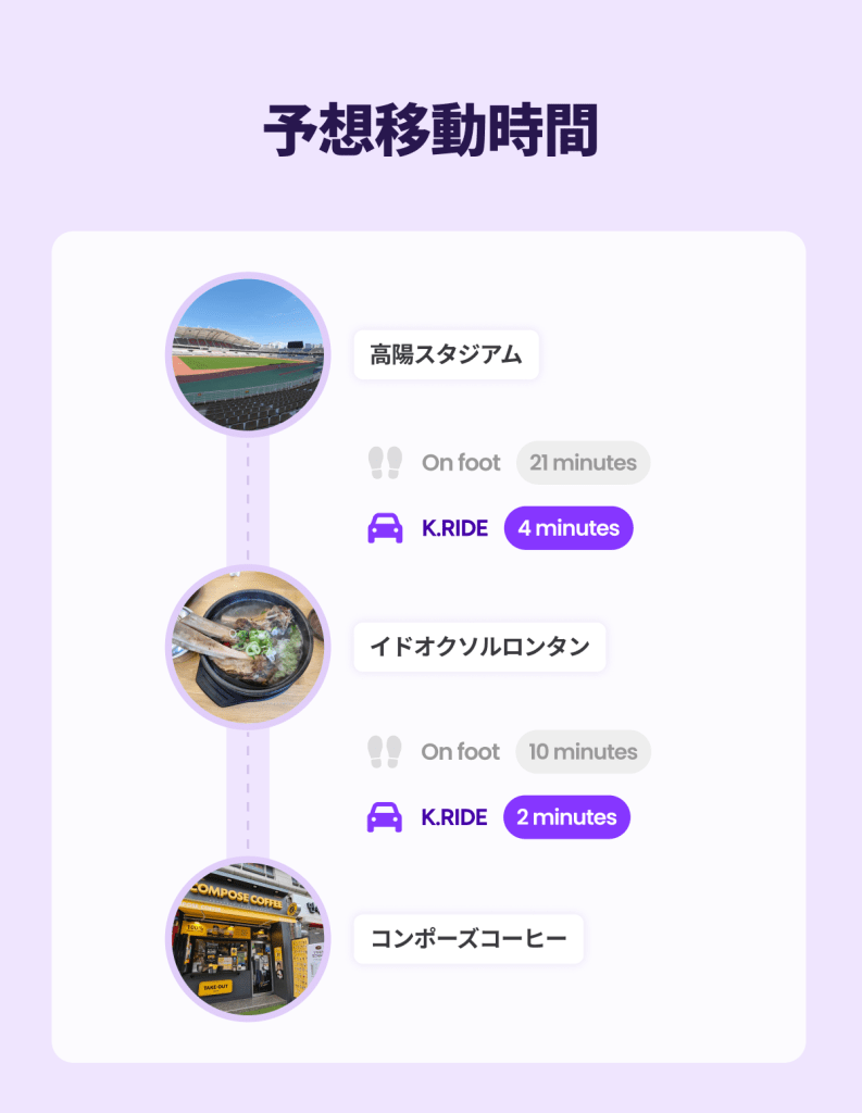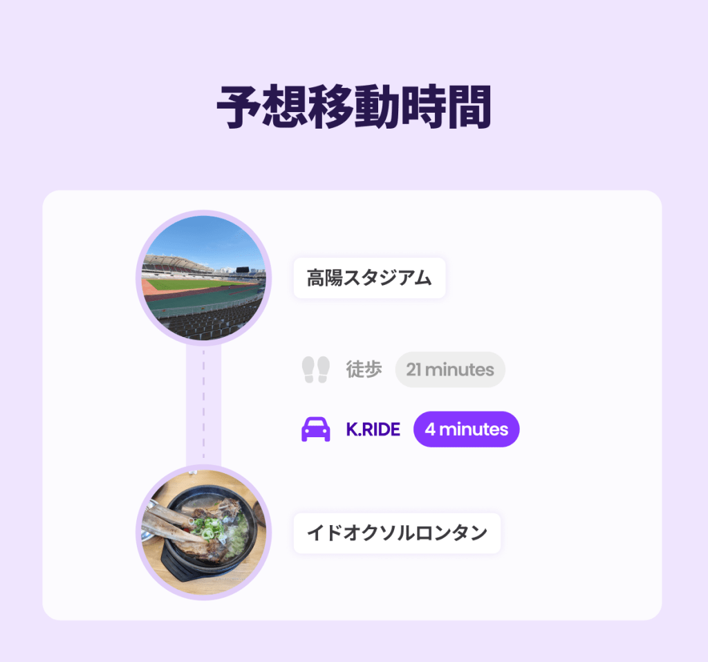目的地を K.RIDE アプリに入力して、最高のコンディションで会場へ向かいましょう。あなたの熱い応援が、きっとスターに届くはずです! 目的地を入力するだけで、スムーズにあなたをエスコートします。あなたのバケットリスト、次はどこに行きたいですか?🚕✨