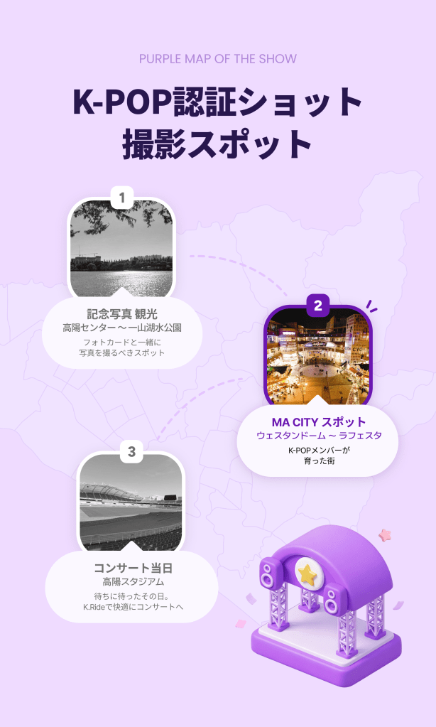 目的地を K.RIDE アプリに入力するだけで、スムーズにあなたをエスコートします。次はついに最終章、**コンサート当日(Concert Day)**編です! あなたのバケットリスト、次はどこに行きたいですか?🚕✨
