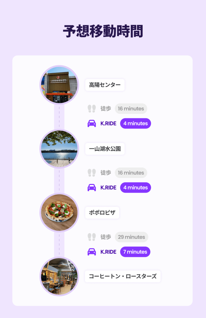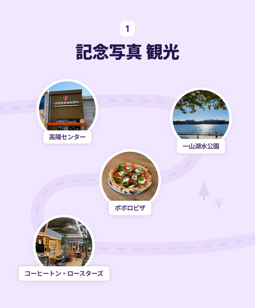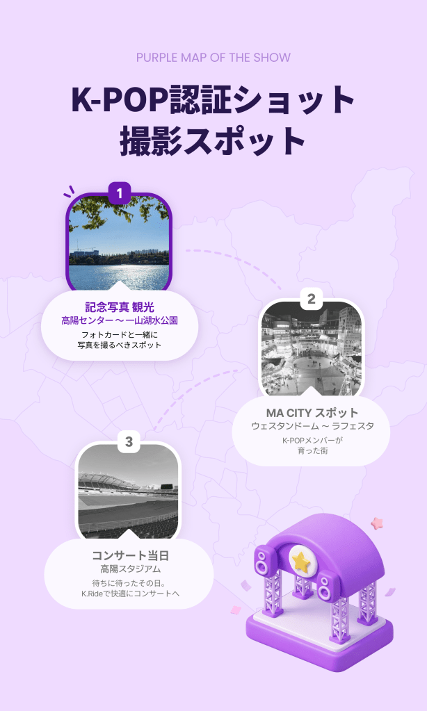 皆さんの推し活旅行をもっと特別なものにするコースをご用意しました!K.RIDEの実際の走行データとファンの皆さんのリアルな推薦に基づき、スターの足跡を感じながら最高の1枚を残せる**『K-POPスター・ファンスポット』**を厳選。聖地巡礼中に立ち寄りたい地元の人気グルメやおしゃれなカフェ情報も満載です。今回の高陽(コヤン)旅行の完璧なガイドとして、ぜひ活用してくださいね!✨」